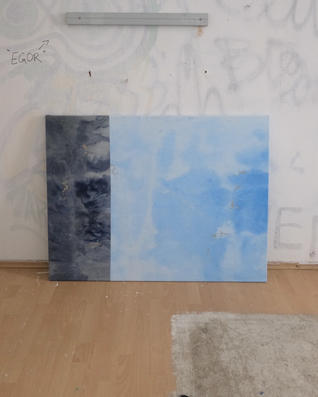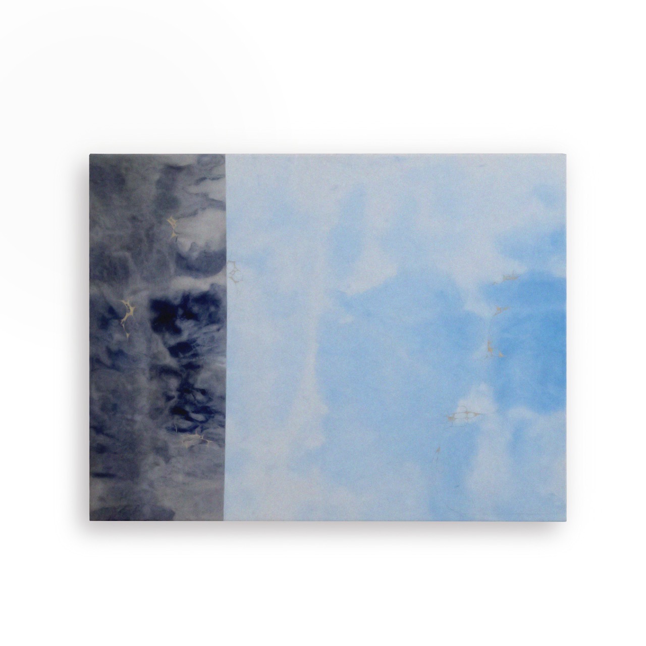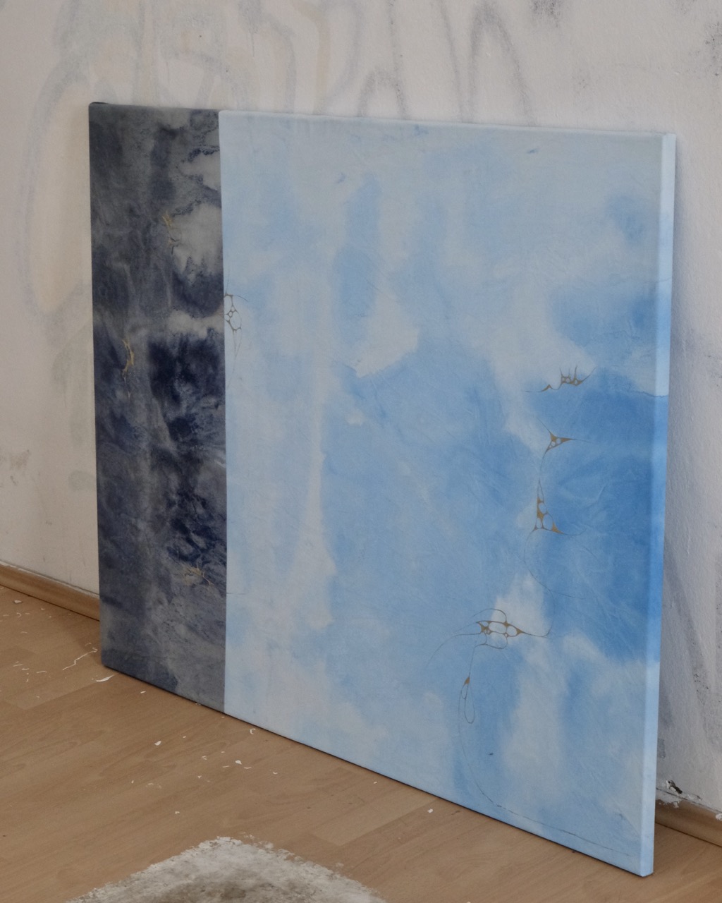 Day & Night is composed of a sky-inspired blue section, with varying light and dark tones that flow into a deeper, more intense counterpart. This darker area is textured with layers of dark lilac acrylic paint, accented by golden details that add depth and structure. The piece creates a dynamic balance, harmonizing contrasting elements while inviting an intriguing exploration of its layers and complexities.