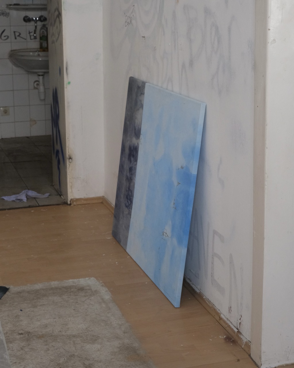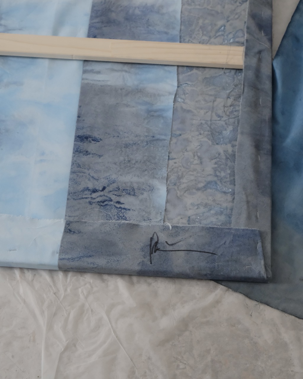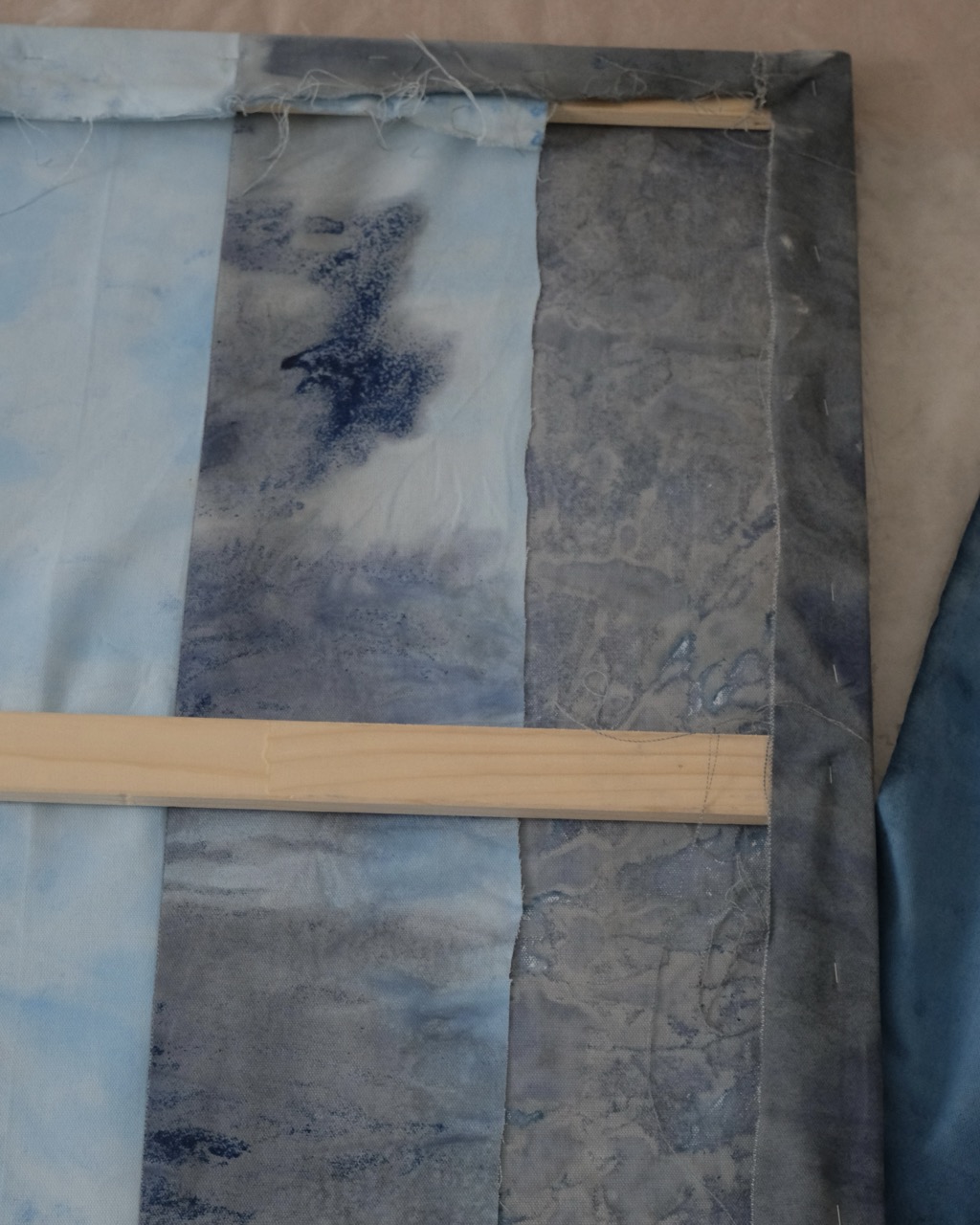 Day & Night is composed of a sky-inspired blue section, with varying light and dark tones that flow into a deeper, more intense counterpart. This darker area is textured with layers of dark lilac acrylic paint, accented by golden details that add depth and structure. The piece creates a dynamic balance, harmonizing contrasting elements while inviting an intriguing exploration of its layers and complexities.