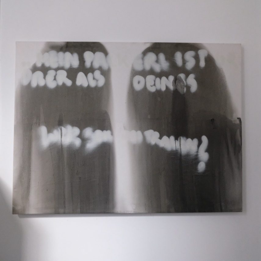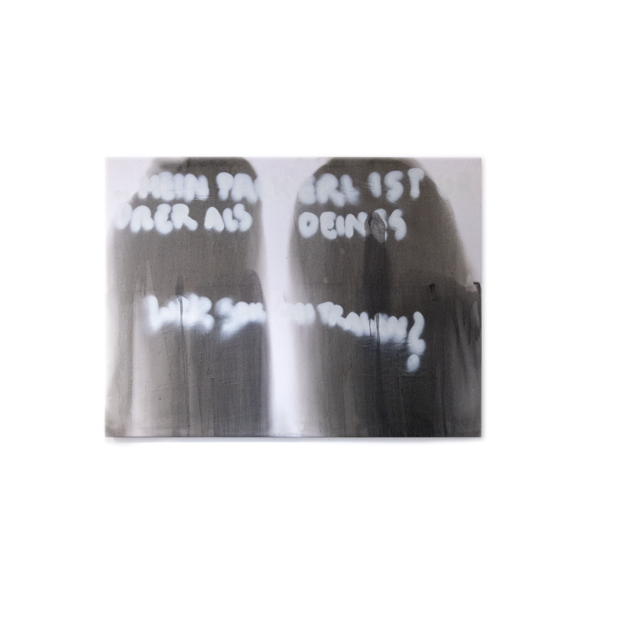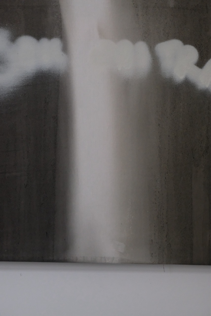 It features two balanced color splashes, separated by a bold, thick off-white acrylic line. Facing each other, the splashes are further defined by a spray paint overlay, prompting the audience with an unanswerable question: Who should be able to hold that? The piece invites contemplation, its visual tension left open for interpretation.