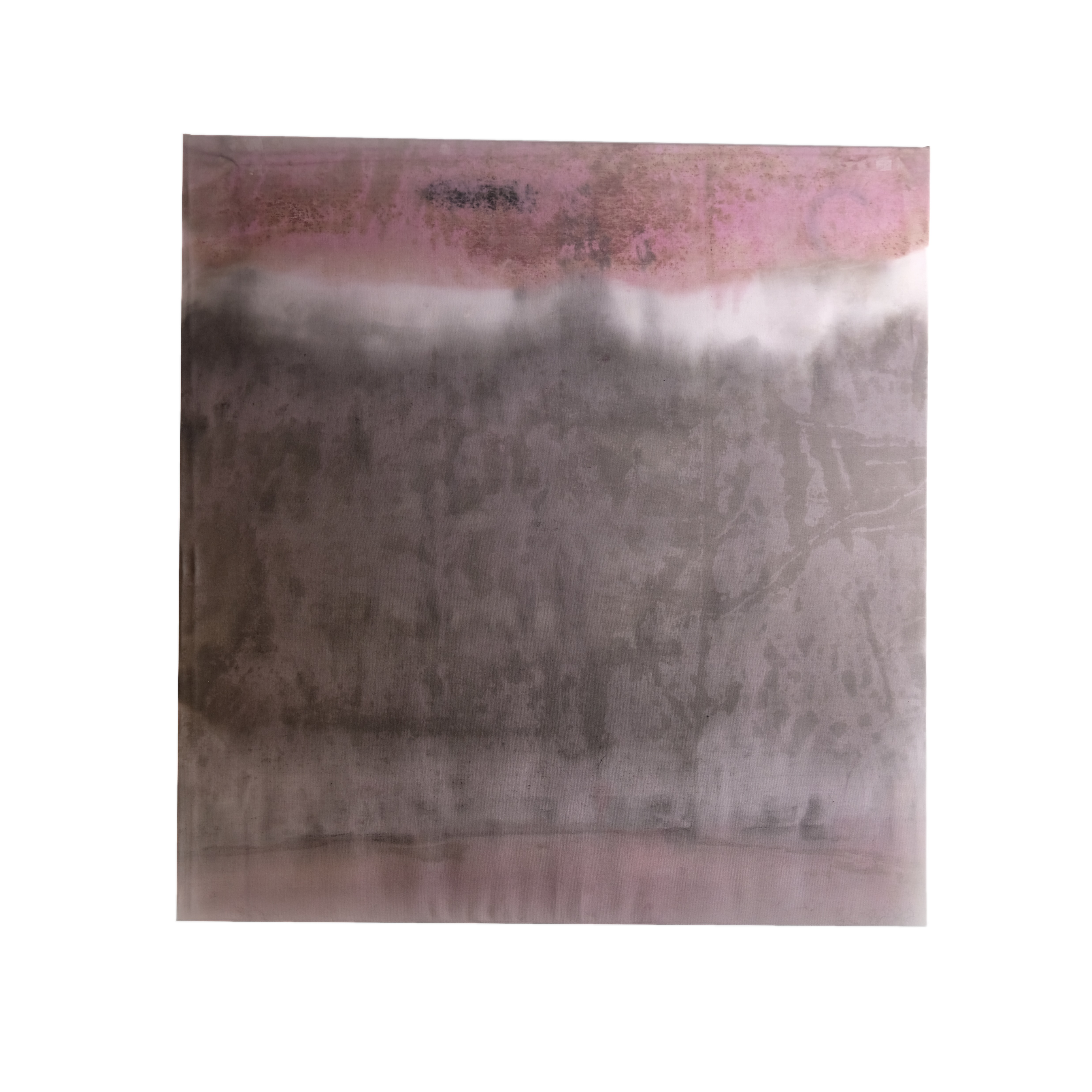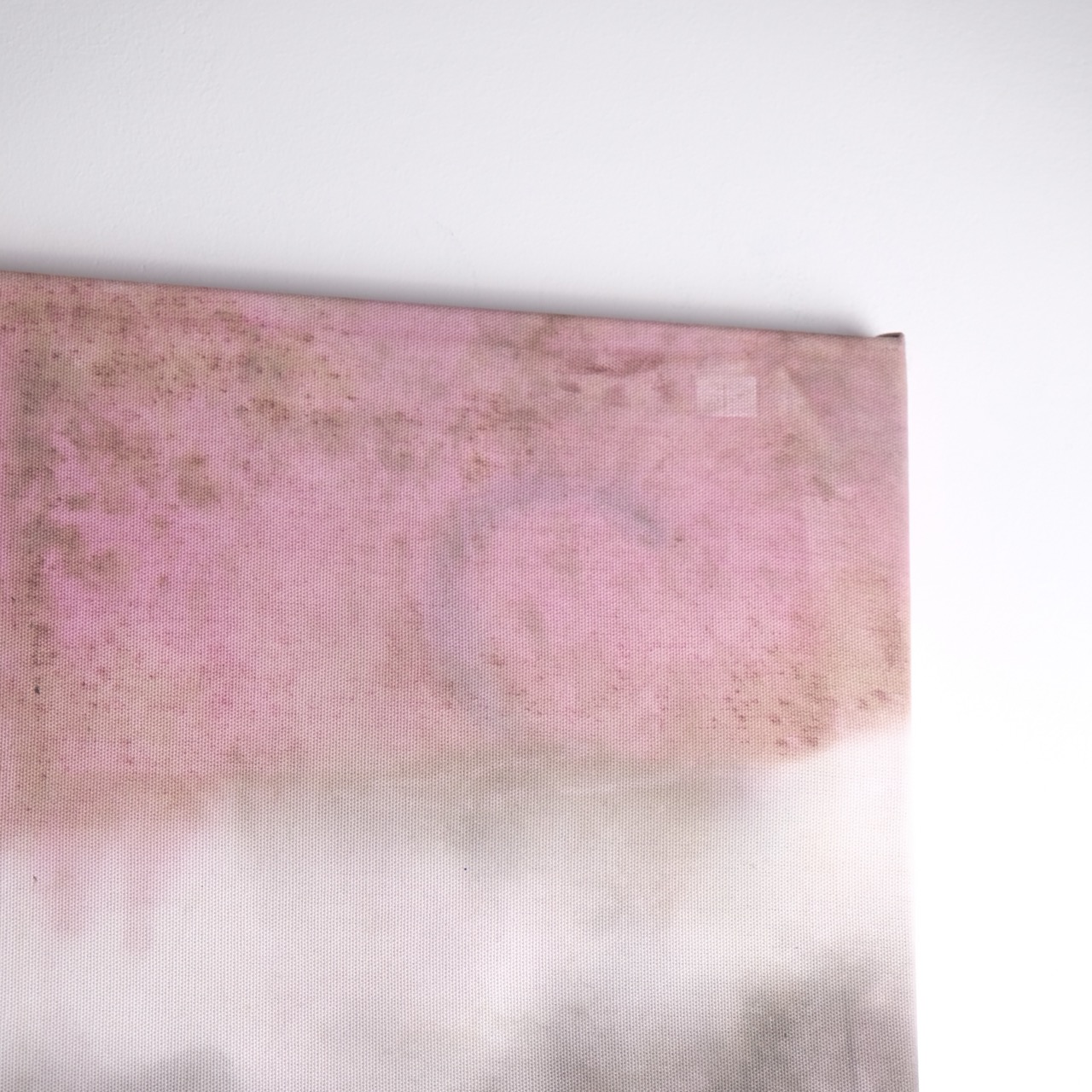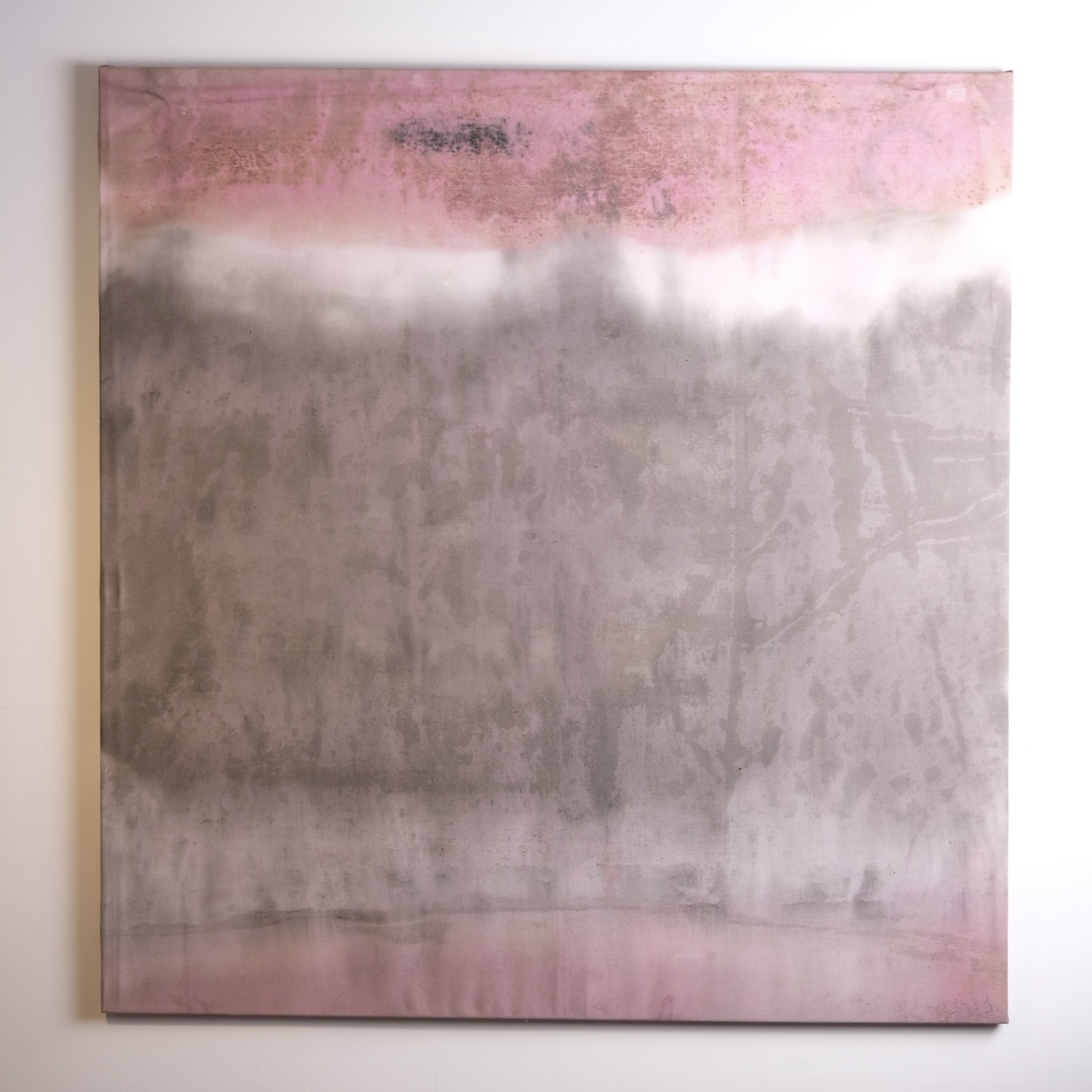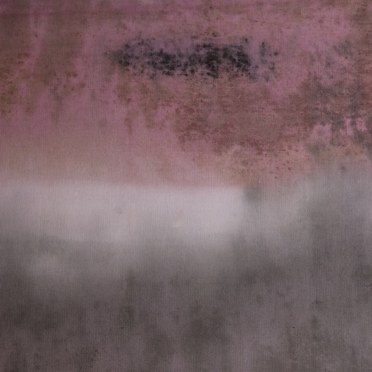 Different layers of red, with darker and lighter hues, press through the canvas. It was created over several days. The piece was crafted through multiple dying processes, leading to these extraordinary dotted patterns.