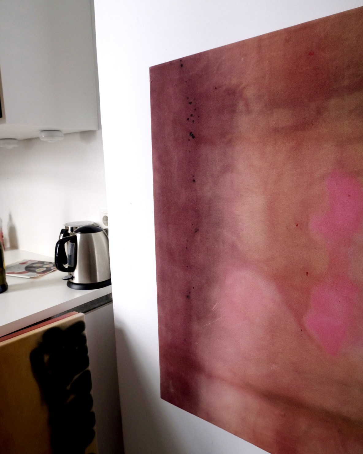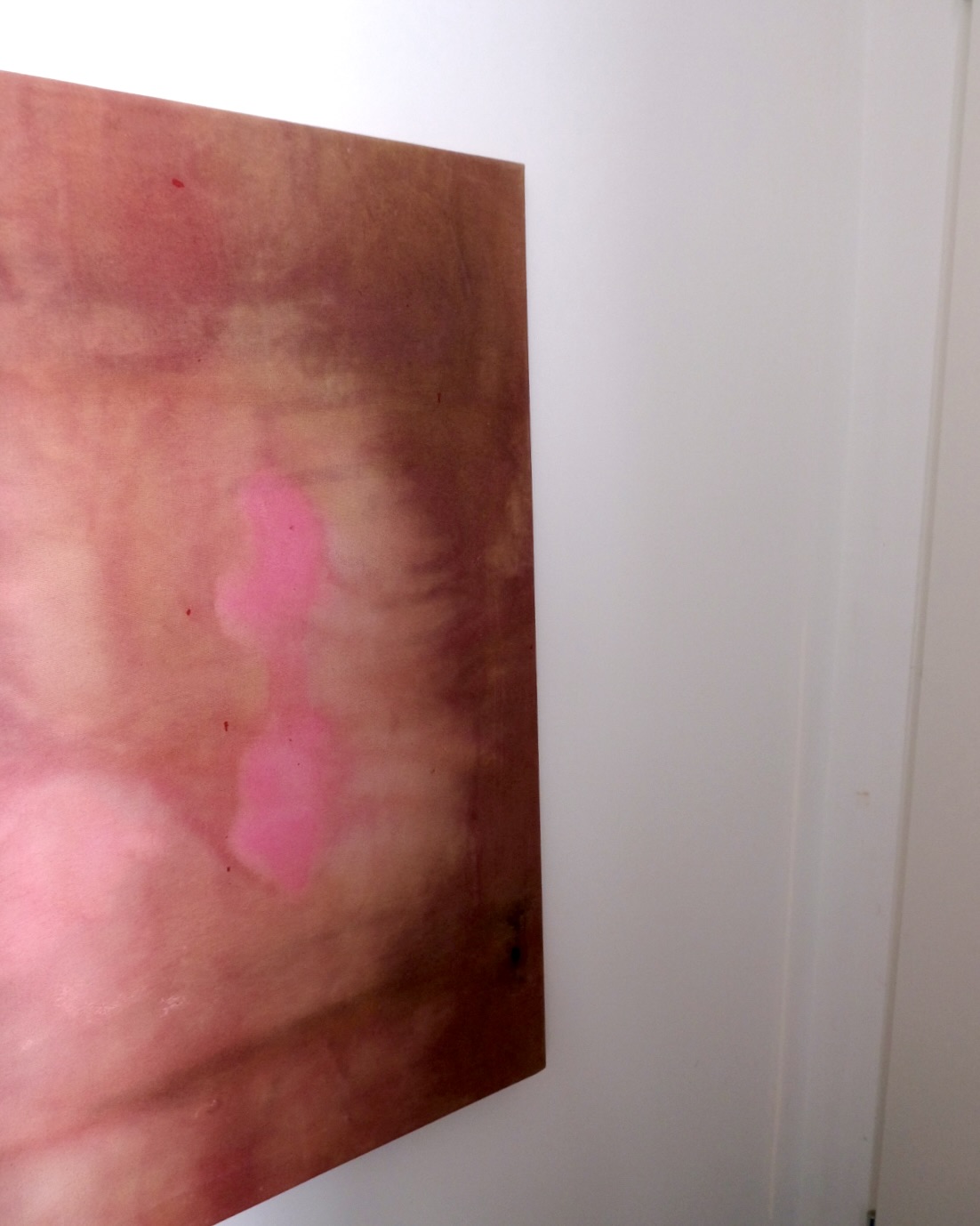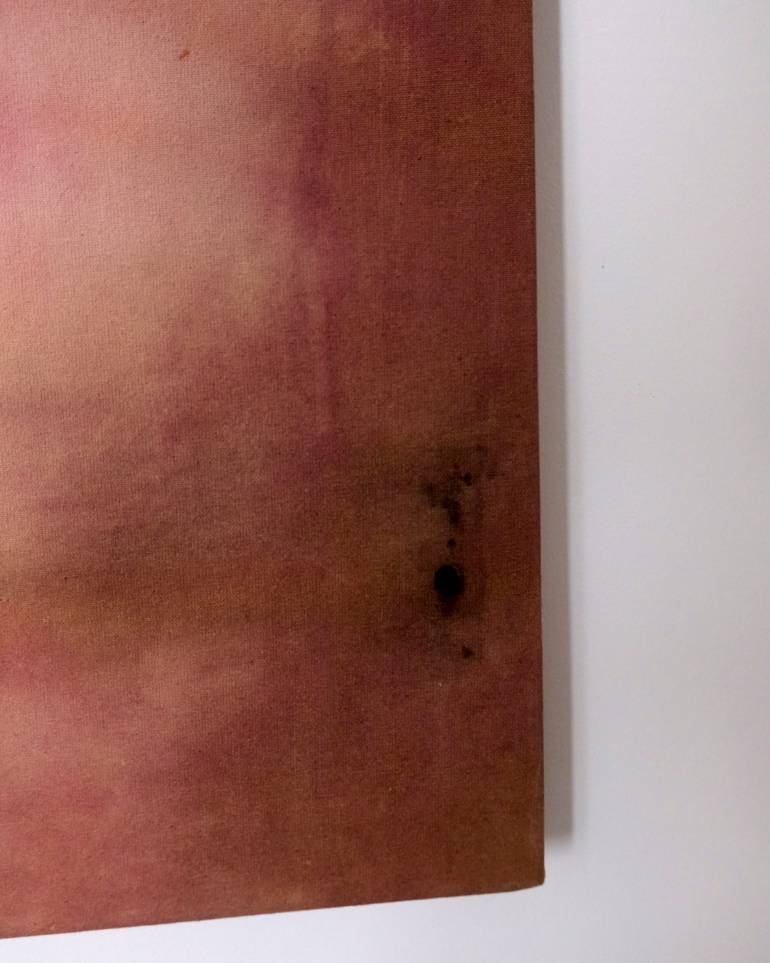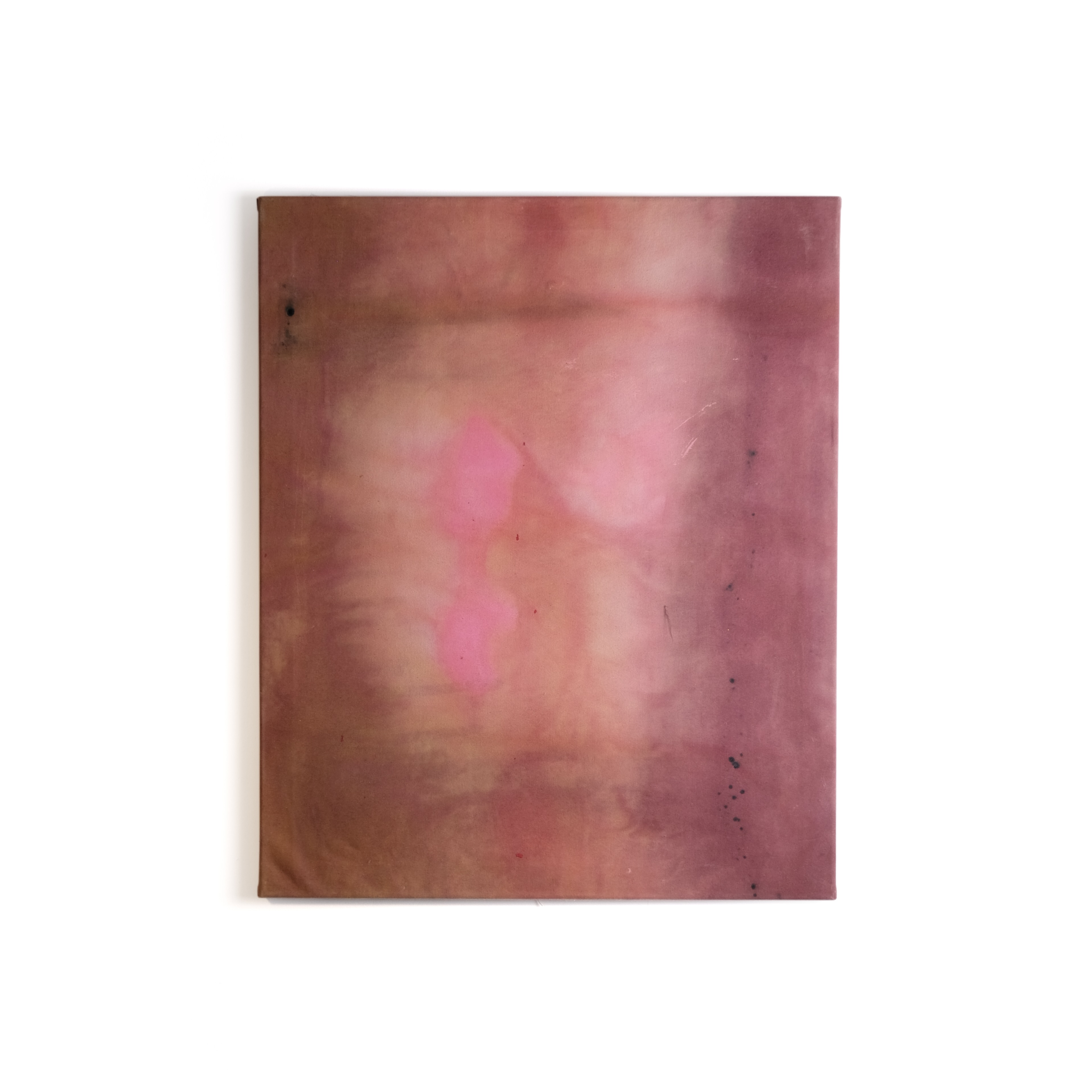 This painting on raw, thin linen is dominated by a deep red color palette, blended with earthy tones. Soft patches of rose-pink acrylic sediment emerge at the center, creating a gentle contrast. Small black spots and subtle marks add texture, while the hazy layers give the piece a quiet, atmospheric presence.