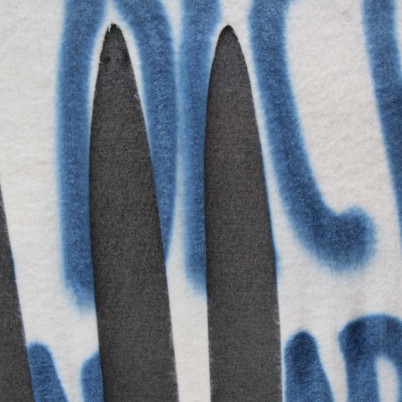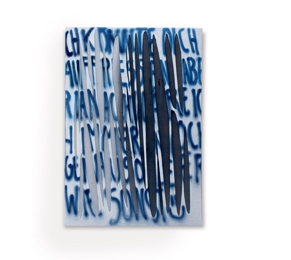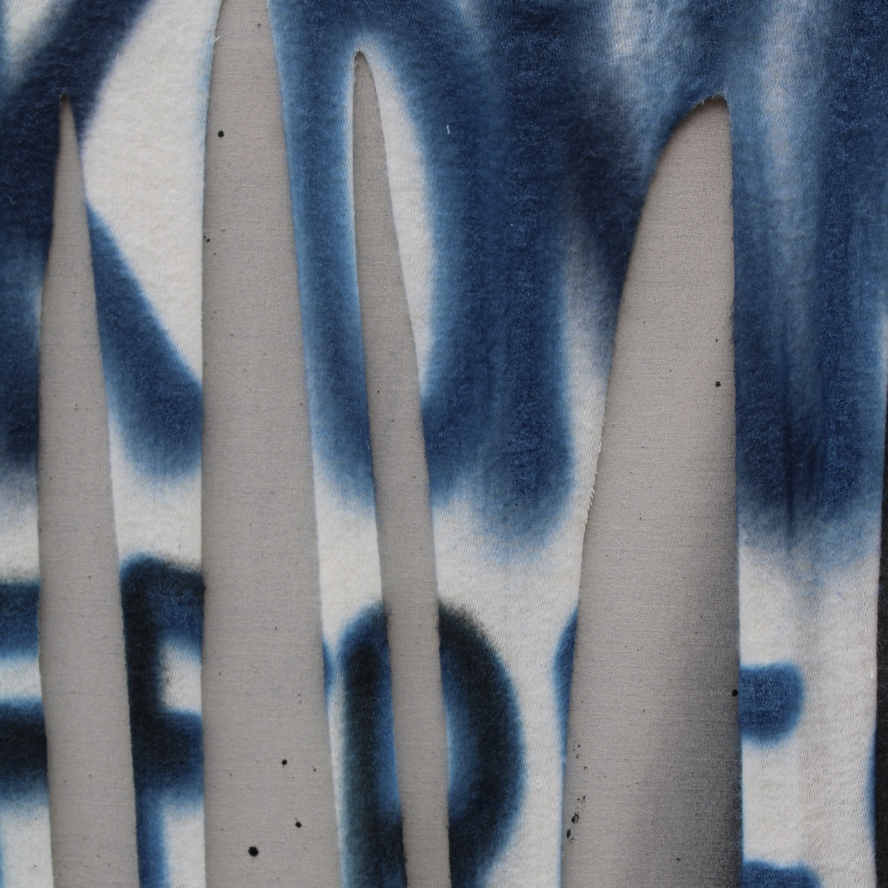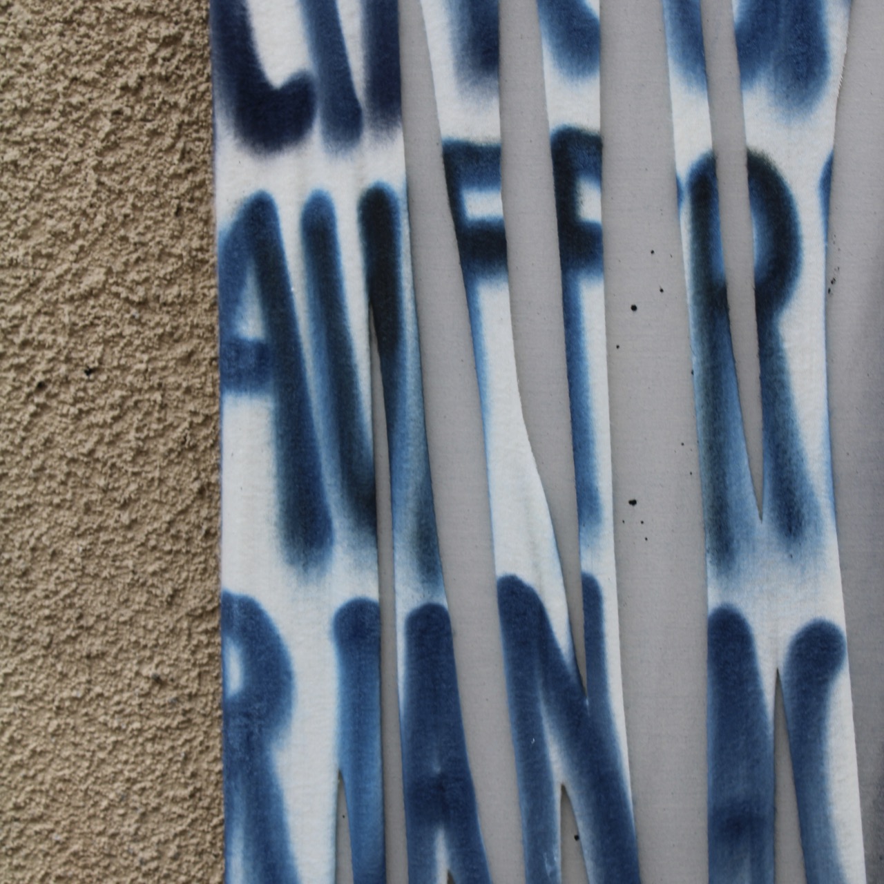 It is a multi-layered artwork featuring a raw linen base, with bold black and white acrylics layered underneath. Above, a soft, textured spray-painted and cut layer creates a three-dimensional structure, inviting deeper interaction from the viewer. The piece presents a subtle riddle, prompting the audience to reflect on the meaning of the text above—whether they can decipher it or what it might signify.